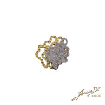 Le forme ondulate del gioiello richiamano il movimento della luce che si genera e si espande; essa si riflette tra i diamanti incastonati su oro bianco per un totale di 3,70 ct e l’oro giallo con lavorazione etrusca.